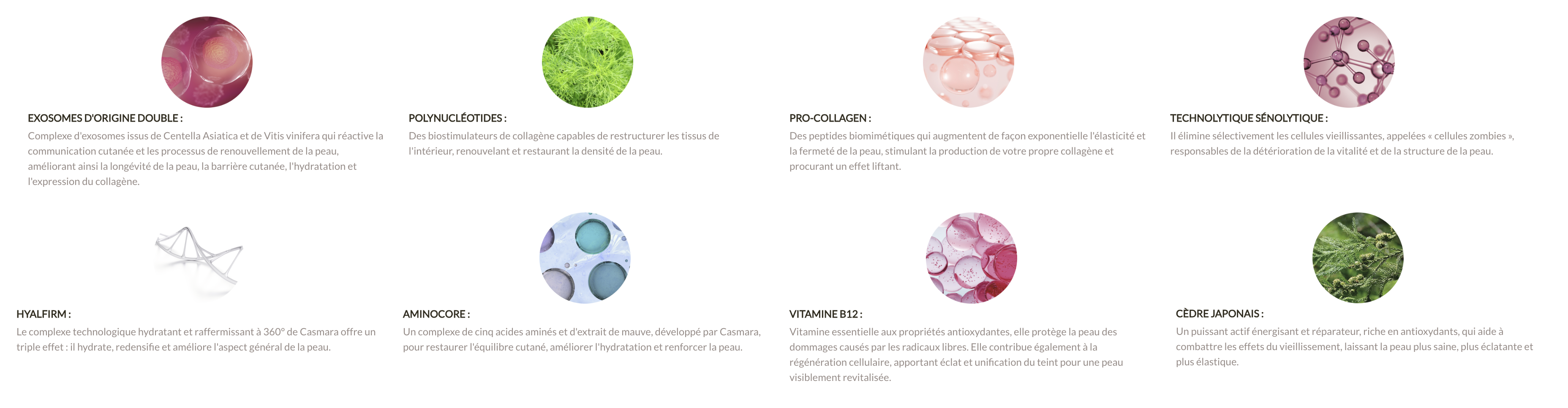 exosomes, fragments de Procollagène et polynucléotides rénovateurs inspirés de la médecine esthétique agissent en synergie pour stimuler le pouvoir régénérant de la peau de l’intérieur.