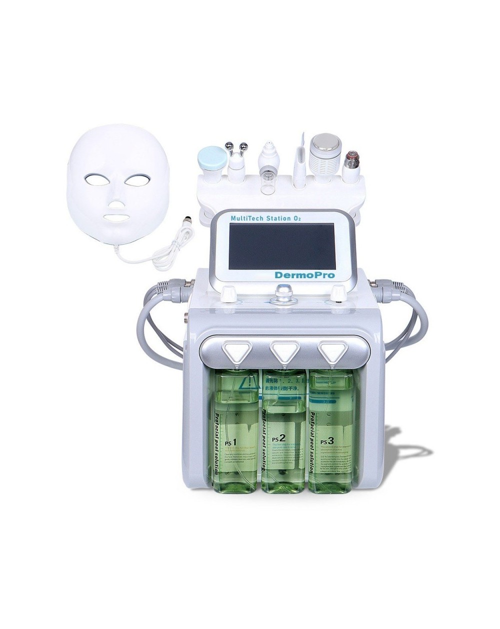 Un compresseur à pression négative réalise une dermabrasion à l'eau. Possibilité de fixer des embouts ajoutant une dermabrasion pointe de diamants.