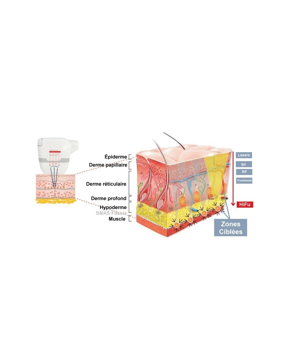 Le dispositif envoie une énergie ultrasonique focalisée hautement concentrée provoquant la coagulation thermique du SMAS (Système musculo-aponévrotique superficiel). Une chaleur élevée se condense sur la zone souhaitée pour stimuler le tissu dermique profond de la peau et produire du collagène. Les niveaux de température les plus élevés sont évités pour empêcher l’ébullition de liquides à l’intérieur du tissu. On obtient ainsi un étirement de la peau, un rajeunissement progressif et plus de fermeté.