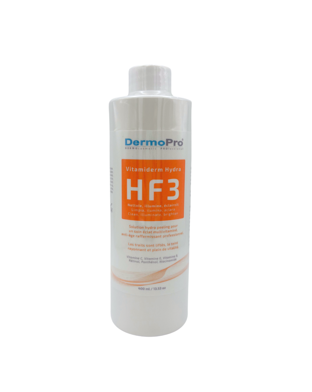 Après le soin Hydro Peeling, rincer Vitamiderm HF3 sur le visage pour les étapes suivantes, notamment la pulvérisation de Meso Solution et Oxygène.