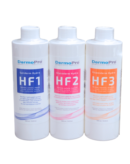 Verser 1/4 de solution Vitamiderm HF3 (100ml) dans le récipient pour Hydro Peeling, compléter avec de l'eau micellaire ou eau déminéralisée (400ml). Augmenter la proportion de solution HF reviendra à apporter davantage d'actifs sur la peau (suite à déjà des soins précédemment, peau matures, peau résistantes...).